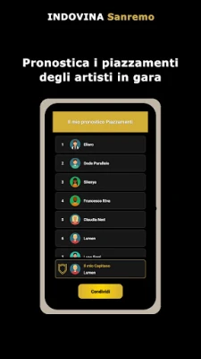 Obogatite svoje iskustvo i personalizujte profil sakupljanjem ekskluzivnih avatara inspirisanih Sanremom. Funkcija 'Pozovi i zaradi' omogućava vam da pozivate prijatelje, osvajate specijalne Baudine i otključavate dodatne, jedinstvene sadržaje. Dizajnirana da bude intuitivna i brza, IndovinaSanremo je pogodna za sve, od dugogodišnjih fanova do novih posmatrača. Za razliku od drugih igara koje simuliraju Sanremo, IndovinaSanremo stavlja fokus na preciznost predviđanja, pružajući vam dublje i analitičnije iskustvo. Živite Sanremo kroz uzbuđenje igre i prognoza!
