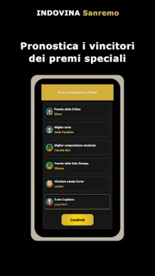 Sa IndovinaSanremo, ulazite u svet detaljnih predviđanja. Od konačnog pobednika i plasmana na podijumu, preko specijalnih nagrada, pa sve do prognoze prvog i poslednjeg mesta – svaka nijansa Festivala je u vašim rukama. Kolo izvođača dodaje jedinstvenu dimenziju: zavrtite ga i neka vam bude dodeljen nasumični umetnik. Performanse vašeg dodeljenog izvođača tokom celog Festivala donose vam dodatne bodove i bonuse, koji se sabiraju sa vašim prognozama, stvarajući jedinstvenu mešavinu strategije i sreće. Nema boljeg načina da doživite Sanremo nego u društvu – kreirajte sopstvene lige ili se pridružite prijateljima, pratite rang-liste u realnom vremenu i utvrdite ko poseduje najizraženiji osećaj za Sanremo senzacije.