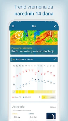Zašto pogađati kakvo će biti vreme kada možete imati potpunu sliku? Aplikacija Vreme & Radar pruža precizne i ažurne vremenske informacije, gde god da se nalazite – bilo da je to Srbija ili bilo koja druga lokacija širom sveta. Sa detaljnim satnim i dnevnim prognozama, kao i izgledima za narednih 14 dana, možete planirati svoje aktivnosti sa samopouzdanjem. Otkrijte trenutne uslove, uključujući temperaturu, verovatnoću padavina, vlažnost, pritisak, UV-indeks, kao i tačno vreme izlaska i zalaska Sunca.